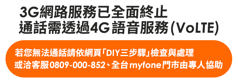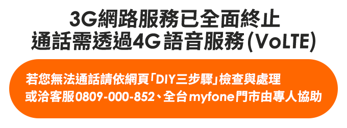 - 本公司協助所有用戶自動開啟4G語音服務(VoLTE)(免收月租費),若您曾經手動關閉或因特殊原因尚未開啟服務,月租型可透過官網、台灣大哥大APP、myfone門市或188客服專線申請開啟,預付卡可透過myfone門市或188客服專線申請開啟;若您持有不支援4G語音服務(VoLTE)之SIM卡(即收到本公司換卡通知簡訊之客戶),請本人儘速攜帶雙證件正本(公司戶需另備登記證、大小章)至myfone門市免費更換SIM卡,換卡後方可開啟服務。