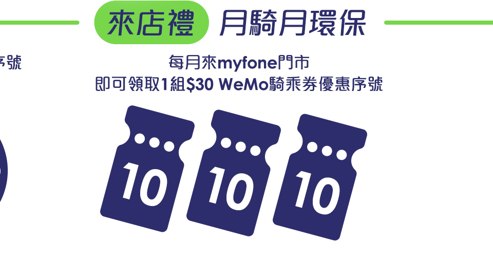 (2)活動內容:活動期間內透過掃描台灣大哥大直營、加盟門市櫃台上活動紙卡QR Code參與活動,活動期間內每月皆可獲得 WeMo Scooter騎乘券10元*3張,騎乘券無法與其他優惠合併使用,騎乘券僅適用於抵扣WeMo騎乘費用,不適用抵扣範圍包括但不限於車體安心保障方案費用、調度處理費、服務費。