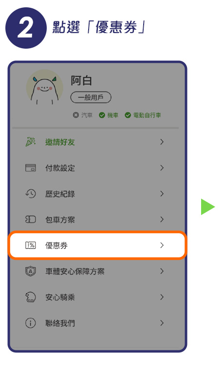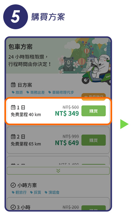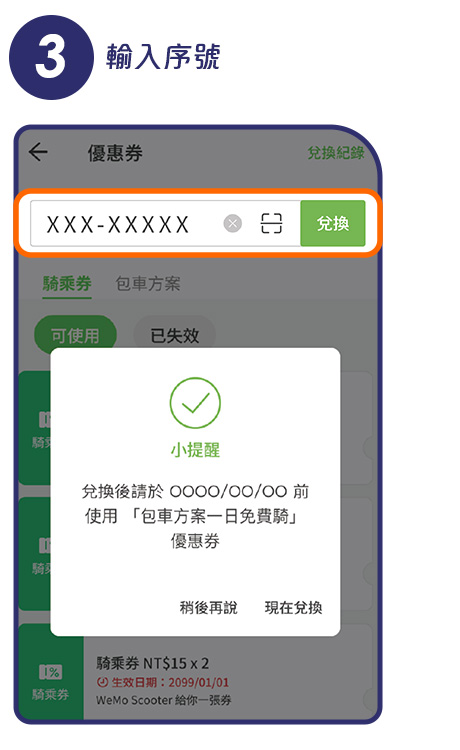 (3)一日免費騎,限「首次」購買包車方案用戶,里程上限 40 km,逾時或超出里程上限需支付額外費用。序號兌換後 14 天內需使用完畢。兌換方式:WeMo APP > 帳戶 > 優惠券 > 輸入序號。使用方式:點擊「包車方案」> 購買 1 日方案 > 套用優惠券 > 付款,此優惠無法與其他優惠券合併使用。