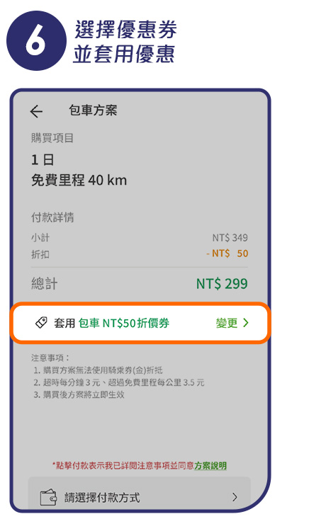 (4)不限新舊戶日租日租包車優惠券 $50 1 張, WeMo 新舊戶皆可使用,限日租以上方案使用。序號兌換後 14 天內需使用完畢,一次限抵用一張。兌換方式:WeMo APP > 帳戶 > 優惠券 > 輸入序號。使用方式:點擊「包車方案」> 購買 1 日方案 > 套用優惠券 > 付款,此優惠無法與其他優惠券合併使用 。