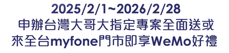 (3)序號獲取:符合資格用戶自行至台灣大哥大會員優惠券專區領取兌換序號,兌換序號請於2026/4/30前輸入兌換,此兌換序號限制首次申辦 WeMo PASS 用戶使用,本優惠與申辦禮(5G申辦禮:WeMo PASS 3個月、4G申辦禮:WeMo PASS 2個月)不可併用,僅能擇一使用。每人限輸入兌換一次,兌換後須於使用期限內(輸入兌換後90天內)使用完畢,逾期將視同放棄優惠資格。(舉例:用戶須於2026/4/30前至WeMo APP內輸入完畢,用戶於WeMo APP輸入完畢後須於90天內使用完畢。)