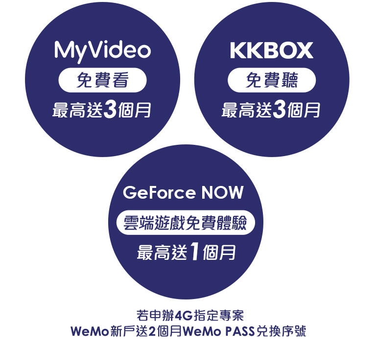 - MyVideo送最高3個月 : 係指2023/10/2起申辦指定專案送MyVideo 3個月月租減免優惠,該優惠不得與其他優惠重疊使用,期滿享優惠價$199(八折)計收,第4個月起未主動申請取消服務者,視為同意繼續使用此服務,若於3個月內取消MyVideo服務視為放棄優惠,不得要求遞延使用、折給現金或轉換成其他優惠。GeForce NOW雲端遊戲服務1個月免費體驗:申辦5G 1399型(含)以上專案用戶可享GeForce NOW雲端遊戲服務最新鈦金方案一個月免費使用(價值$599) 之優惠。免費期間屆滿前,使用者若未取消者,即視為同意本公司於到期日前自動幫使用者延長本服務,以30天為期,按期展延,服務費將按期持續出帳收費,其後亦同;若於贈送期間內取消本服務視為放棄優惠,不得要求遞延使用、折給現金或轉換成其他優惠。本服務僅提供雲端遊戲平台使用權利,用戶須自行準備遊戲,並透過本服務平台所支援的線上數位遊戲平台進行會員帳號綁定後,始可於本服務平台上遊玩免付費、已購買或新購買且本服務所支援的遊戲。本服務將持續更新,實際內容以本服務官網與遊戲平台為主。除了免付費遊戲外,付費遊戲必須預先至合作的數位遊戲商店平台購買,始可於遊戲平台使用。視個別遊戲支援限制,某些遊戲可能無法支援Android作業系統或遊戲控制器。使用遊戲平台所產生之傳輸費,將依選用之行動上網費率計費;國際漫遊另計。本服務詳情可上GeForce NOW官網查詢。