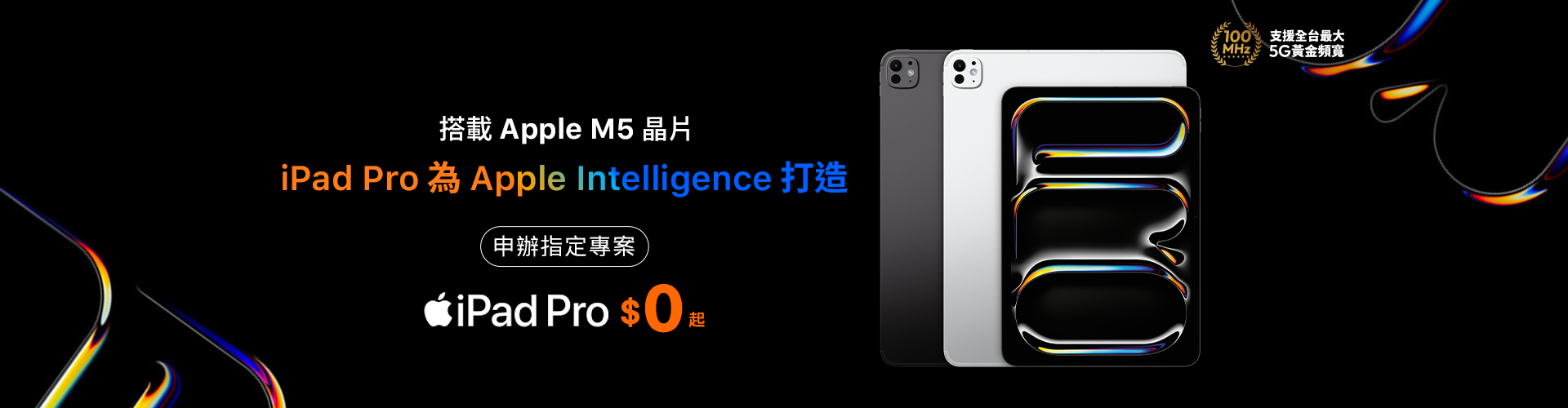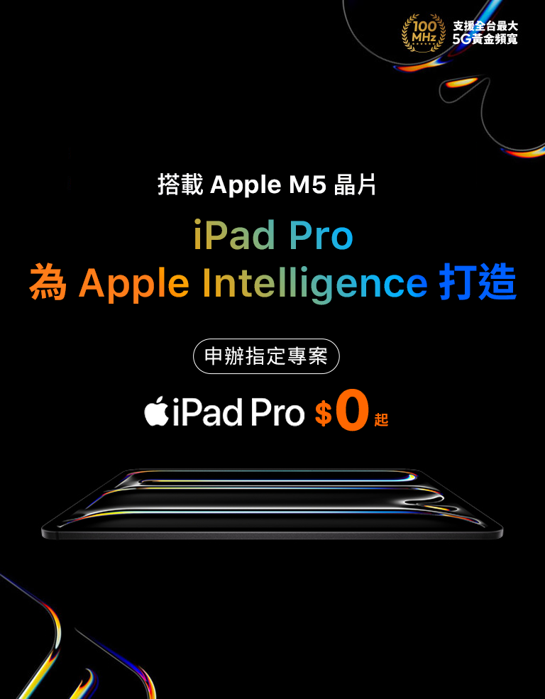 - iPad A16專案價$0起係指申辦5G 1199型(含)以上資費專案,綁約30個月(含)以上,iPad A16_128G (WiFi) 專案價$0,申辦5G 1399型(含)以上資費專案,綁約48個月(含)以上,iPad Air M3(11吋)_128GB (WiFi) 專案價$0,申辦5G 2699型(含)以上資費專案,綁約48個月(含)以上,iPad Pro M5 (11吋)_256GB (WiFi) 專案價$0,申辦5G 999型(含)以上資費專案,綁約48個月(含)以上, iPad mini (A17 Pro)_128GB (WiFi) 專案價$0,部分專案須預繳。