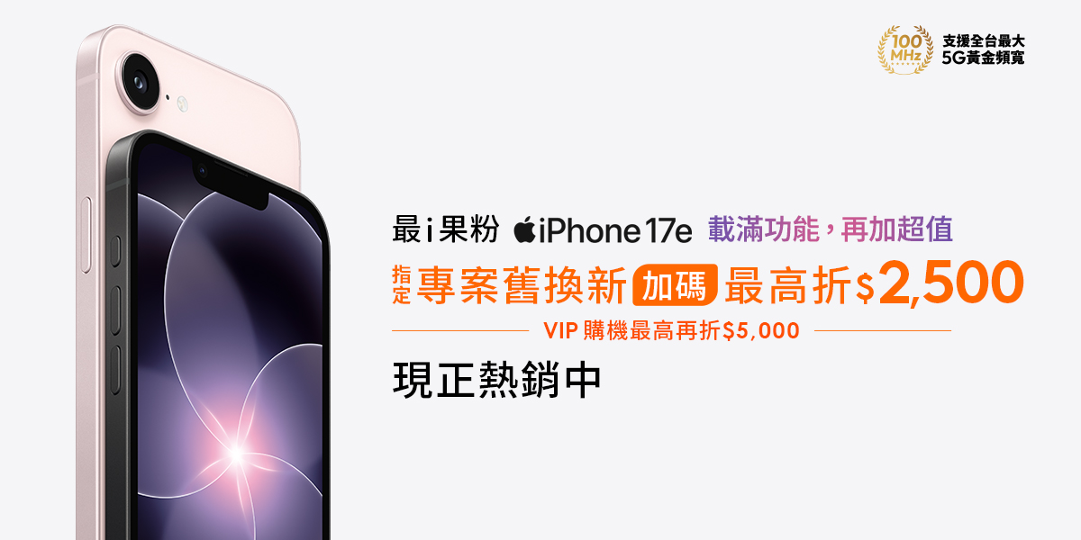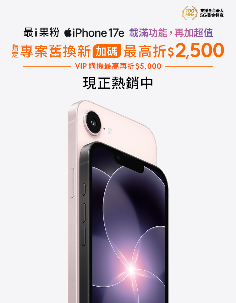 - myfone網路門市電信預約/單機預購iPhone 17e系列加碼抽$1,000:(1) 活動期間2026/3/4至2026/3/10止,搭配指定電信方案預約或單機預購,免登記即可抽1,000元 myfone online電子禮券(電信預約/單機預購各10名)。(2)參加本活動須為myfone網路門市會員,贈送之myfone online電子禮券將於2026/4/10起陸續派送至會員帳戶,有效期限均為匯入日後15天內,逾期未使用完畢即為失效。(3)於myfone網路門市預約申請指定電信方案並搭配iPhone 17e系列新機者,預約完成後須完成回購與門號綁約流程,即可符合活動抽獎資格。(4)於myfone網路門市單機預購iPhone 17e系列新機者,需在活動期間內預購、並完成付款,且無付款失敗、訂單取消、退貨等條件者。如遇付款失敗、訂單取消、退貨等取消交易之情事,代表放棄參加及得獎資格。(5)客戶是否符合本活動之資格及參加本活動是否成功及遊戲記錄皆以myfone 網路門市電腦系統資料為準。