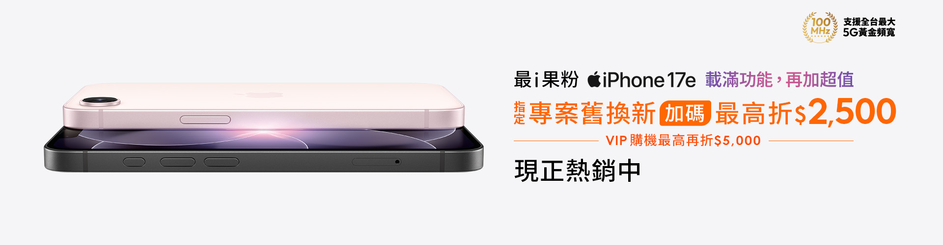 - 「舊換新加碼活動」係指本月活動期間限本國人於myfone直營及加盟門市申辦。回收舊機須經門市人員檢查確認可受理後,始可進行折抵,回收價格等級及折抵金額以門市人員認定為準。僅限折抵用戶本人申辦之5G綁約專案搭配機款或單購空機之價款,若折抵後有剩餘,可折抵項目以台灣大哥大最新公告為準。舊機回收價格將會依市場狀況、手機狀況等因素而有波動,每月最新回收價格請以門市現場實際報價為準。詳細規定以服務約定書為準。舊機回收最高折抵$30,000元係指回收機款為Apple iPhone 16 Pro Max 1TB(5G)最高判等之回收價$30,000元。「i17系列舊換新加碼」係指新申辦/攜碼/續約5G 999(含)以上指定案,搭配iPhone 17系列(含iPhone 17e、iPhone Air) 並將舊機交由本公司回收,可享手機折價(1)申辦5G 999/1199型指定5G指定專案,享最高折價1000元之優惠。(2)申辦5G 1399型指定專案,享最高折價2,000元之優惠。(3)申辦5G 1599/1899/2699型指定5G指定專案,享最高折價2,500元之優惠。實際折抵金額以機款專案價格為限,最多折至$0。優惠折抵項目依各申辦門市為準,折抵後若仍有應付費用應繳納之。舊換新最高可享32,500元優惠係指舊機回收Apple iPhone 16 Pro Max 1TB(5G)最高判等,並申辦5G 2699型指定專案,搭配iPhone 17系列,最高可享32,500元折價優惠。實際折抵金額以機款專案價格為限,最多折至$0。優惠折抵項目依各申辦門市為準,折抵後若仍有應付費用應繳納之。申辦資格依本公司系統判斷為準。企客專案不適用。