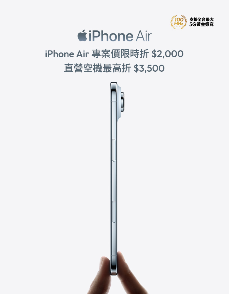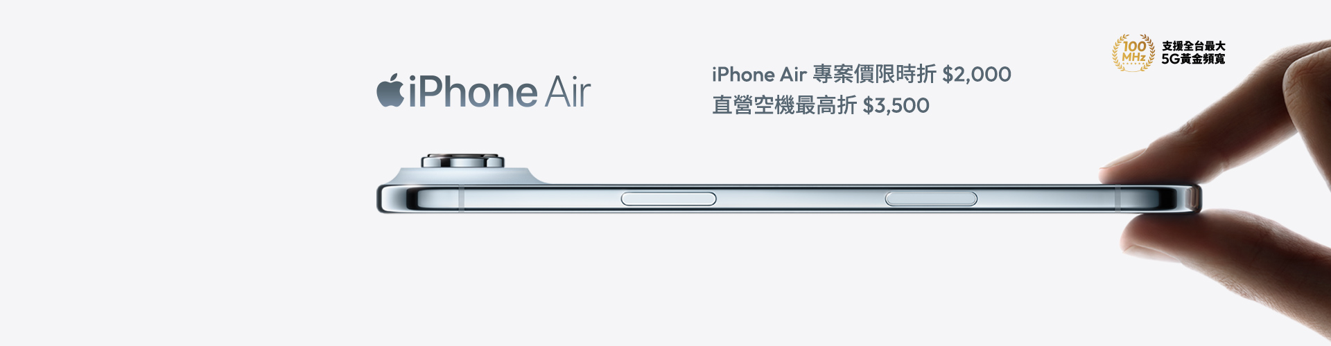 - 直營空機最高折$3,500元係指2026/2/12~2026/3/31,於台灣大哥大全台直營門市購買iPhone Air 1TB空機,可享優惠價格$47,400(較Apple官網售價優惠$3,500) ; 購買iPhone Air 512G空機,可享優惠價格$40,900(較Apple官網售價優惠$3,000) ; 購買iPhone Air 256G空機,可享優惠價格$34,400(較Apple官網售價優惠$2,500),實際可購買的容量、顏色庫存以門市現場為準。