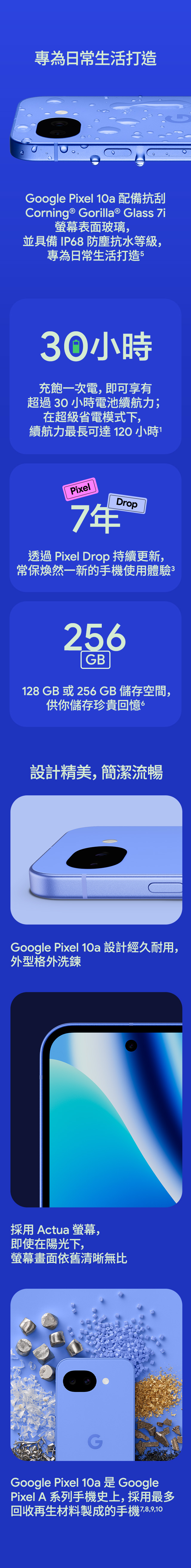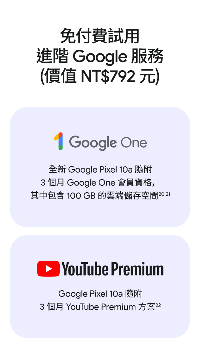 - 指定專案$0起帶走:係指申辦5G 1399資費專案,綁約36個月,並搭配Google Pixel 10a (8G/128G),手機專案價$0,部分專案須預繳。