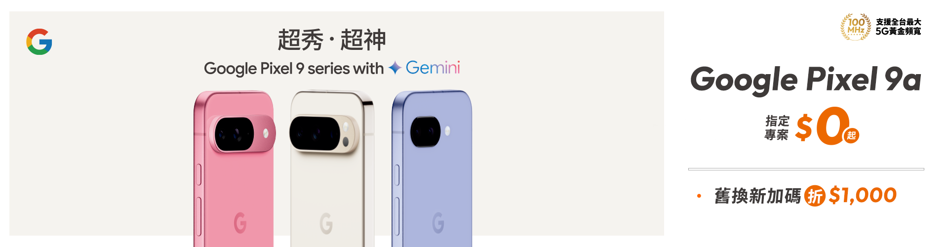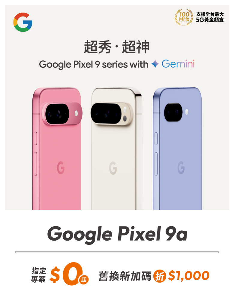 - 指定專案$0起帶走:係指申辦5G 1399資費專案,綁約30個月,並搭配Google Pixel 9a (8G/128G),手機專案價$0,部分專案須預繳。