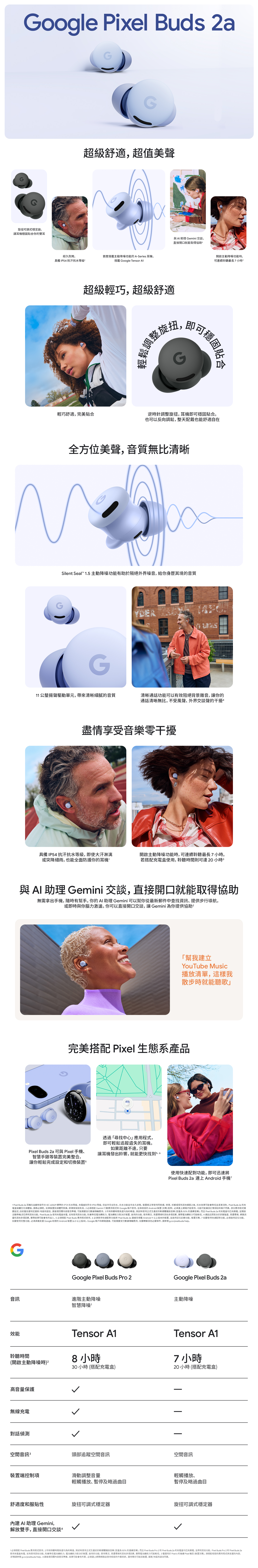 - Pixel Buds 2a:114/10/9-114/10/31搭配指定專案,藍牙耳機 0元帶回家:係指申辦4G/5G 599型(含)以上資費專案,綁約30個月,並搭配Pixel Buds 2a專案價$0,部分專案須預繳。