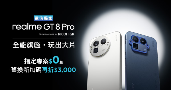 - 指定機型舊換新加碼折價優惠:係指115/1/2至115/2/28參加舊換新活動限申辦5G月租型指定專案realme GT 8 Pro可享較原專案價再折$3,000。實際折抵金額以機款專案價格為限,最多折至$0,且不與現行其他續約折價併用。優惠折抵項目依各申辦門市為準,折抵後若仍有應付費用應繳納之。申辦資格依本公司系統判斷為準。