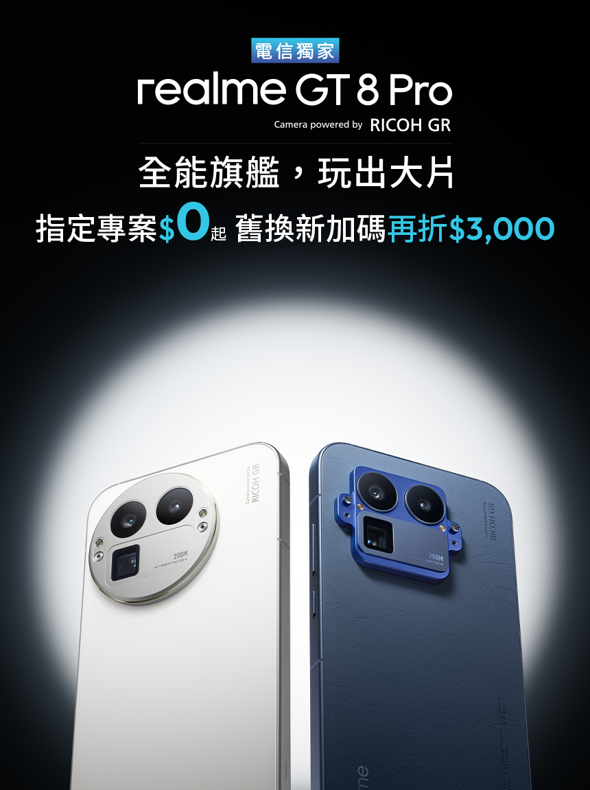 - 指定專案$0起帶走:係指申辦5G 2699資費專案,綁約48個月,並搭配realme GT 8 Pro手機專案價$0,部分專案須預繳。