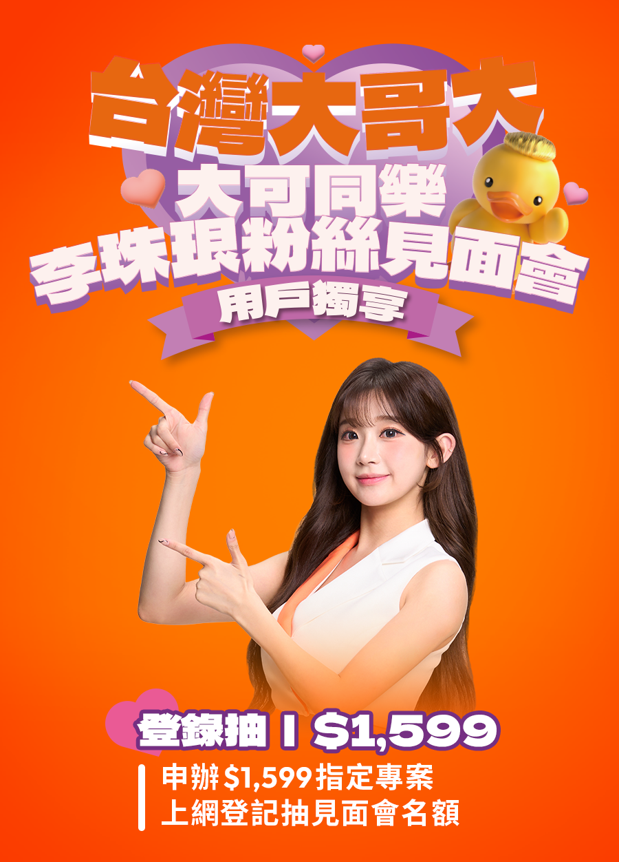「申辦 5G 1,599 型指定專案及機款抽大可同樂|李珠珢粉絲見面會參加名額」係指(1)新申辦 / 攜碼 / 續約月租型 1599 型以上指定專案生效搭配指定機款並實際完成門號開通;申辦指定好速專案者需同時專案生效且寬頻完成竣工(新申辦 / 攜碼 須符合 門號已開通 / 改接生效、續約 須符合 專案已生效),並於 2025/11/02 前至台灣大官網活動頁面登錄成功之用戶,可獲得《大可同樂|李珠珢粉絲見面會》抽獎資格乙次,本活動共計抽出 150 名。