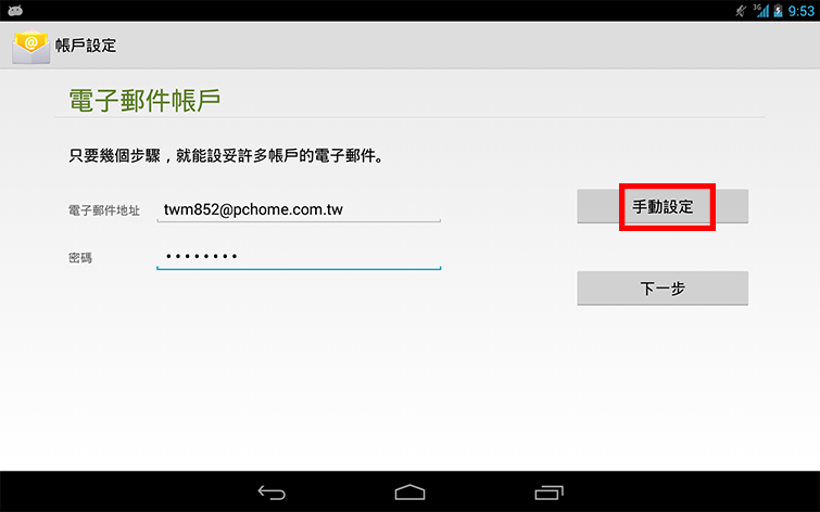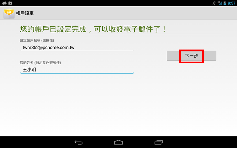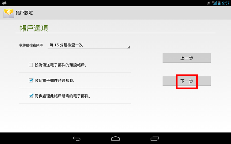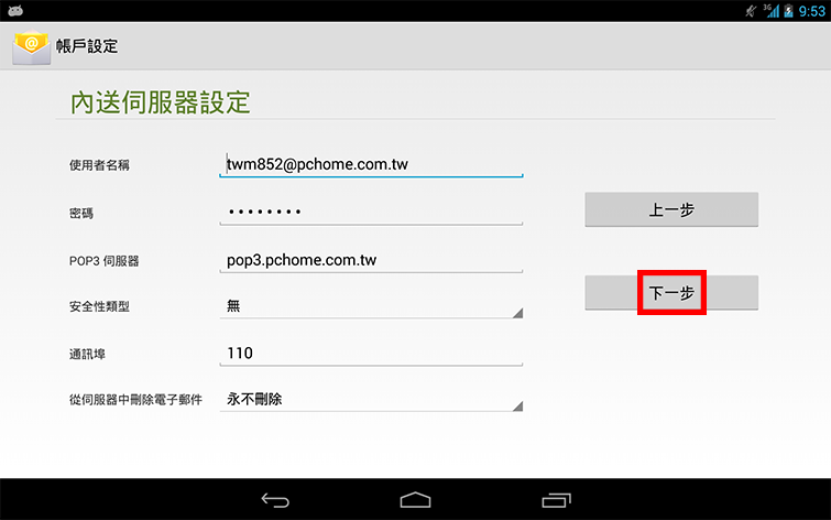 5.根據您的MAIL供應商提供的參數,依序輸入,再點選【下一步】 |