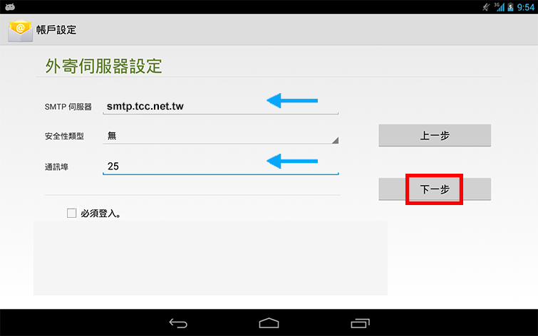 | 6.SMTP伺服器請輸入【smtp.tcc.net.tw】、通訊埠【25】,再點選【下一步】 |