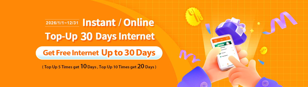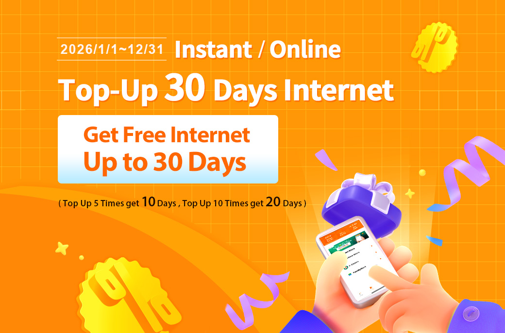 【Instant / Online Top-Up 30 days internet, Recharge 10 times and get 30 days internet for free !】