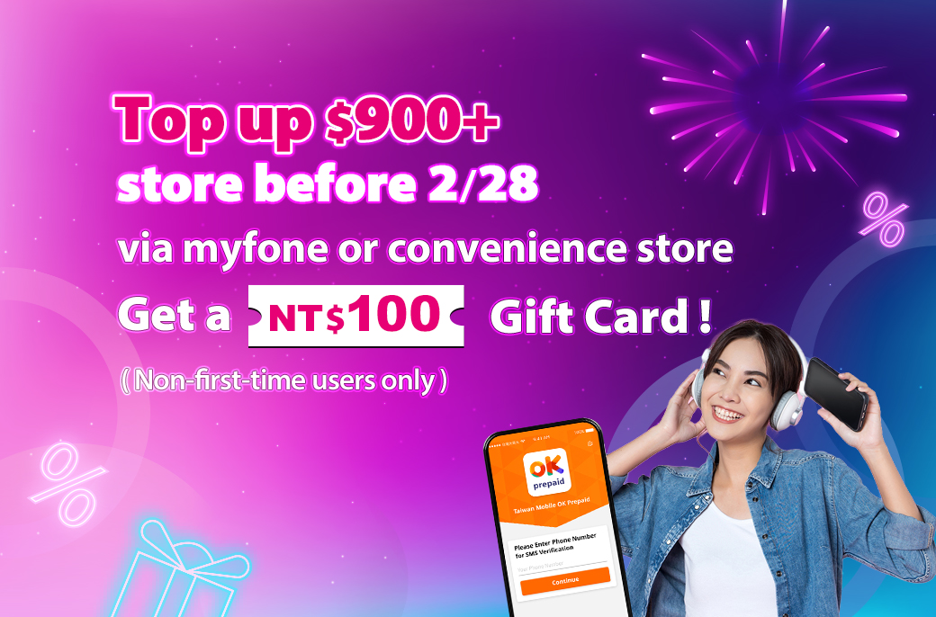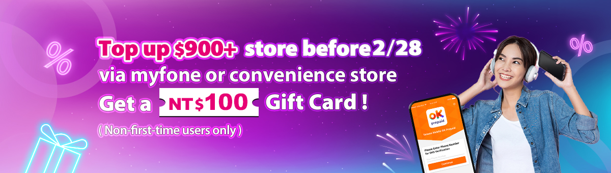 - Top up $900+ via myfone store or convenience stores before 2/28 to get a free NT$100 gift card! PIN code will be sent via SMS next month. (Returning users only, no OKAPP top-up in last year.)