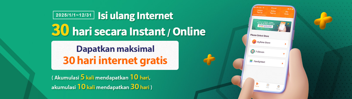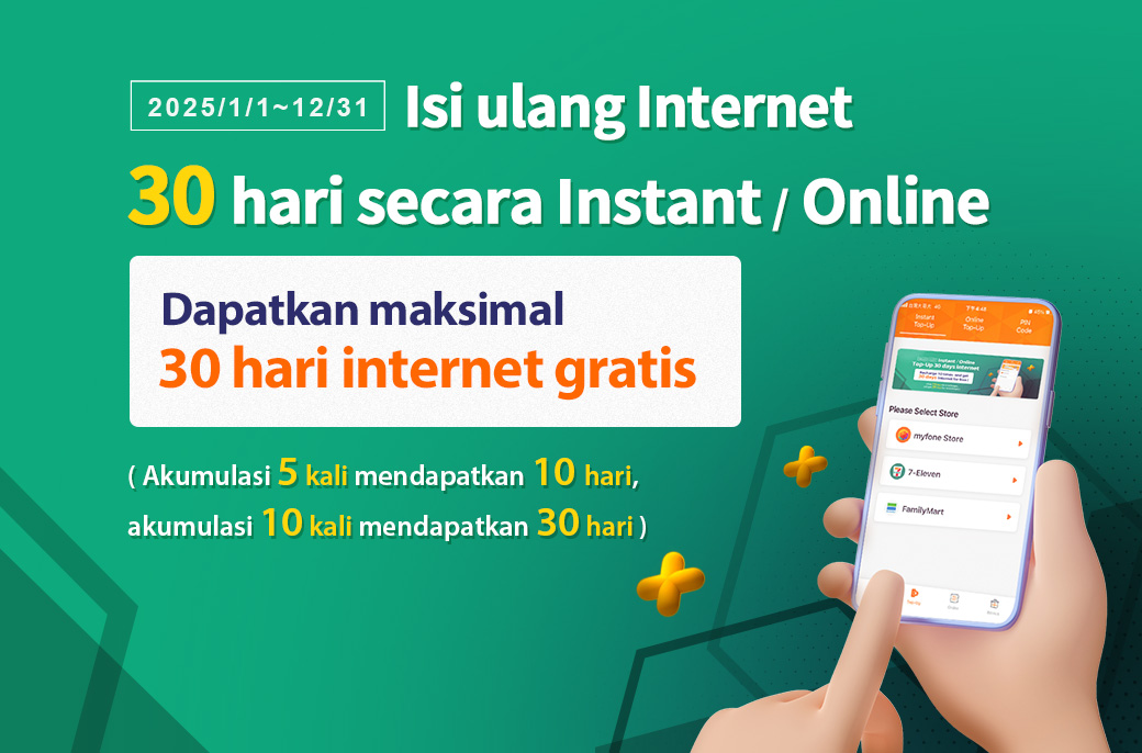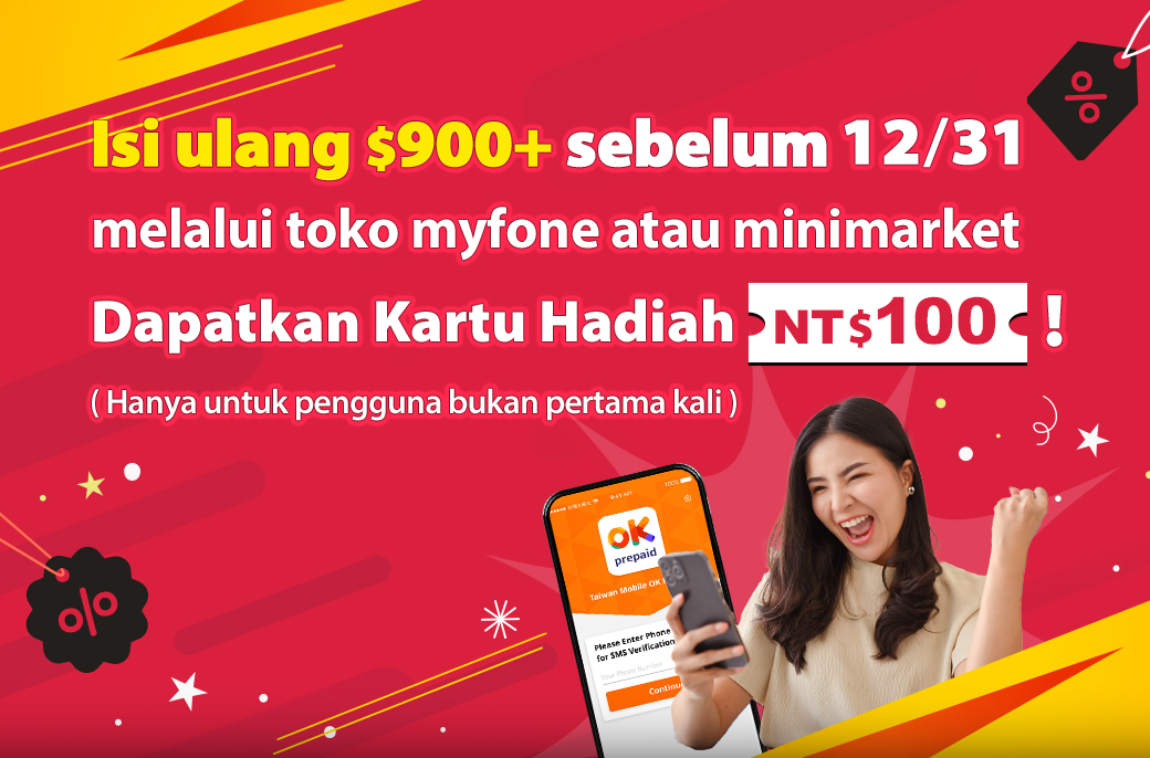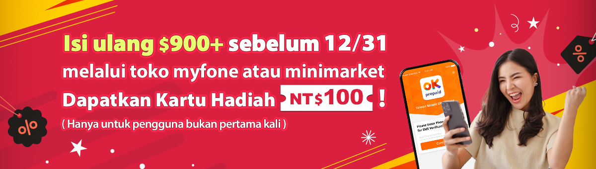 - Isi ulang $900+ melalui toko myfone atau minimarket sebelum 12/31 untuk mendapatkan kartu hadiah NT$100 gratis! Kode PIN akan dikirim melalui SMS bulan depan. (Hanya berlaku untuk pengguna bukan pertama kali. Setiap pengguna dibatasi satu hadiah per bulan.)
