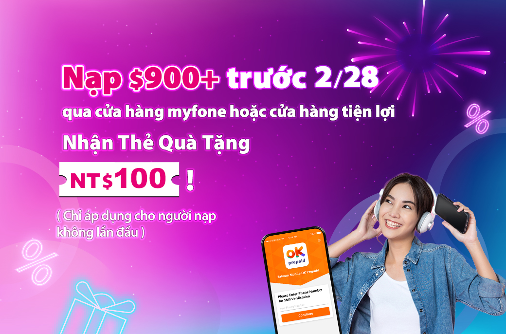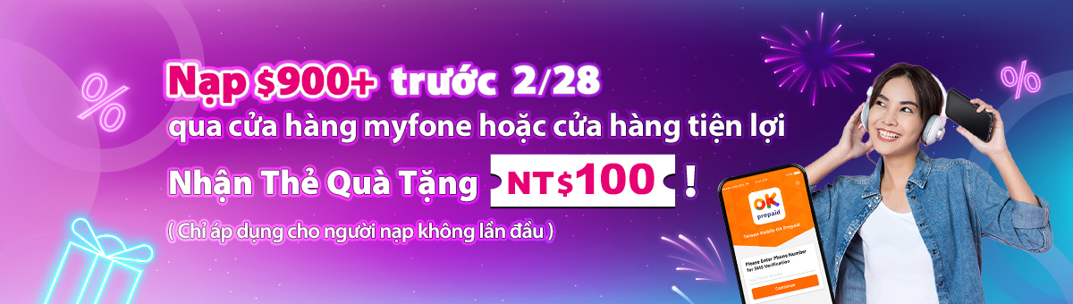 1. Nạp $900+ qua cửa hàng myfone hoặc cửa hàng tiện lợi trước 2/28 để nhận miễn phí thẻ quà tặng NT$100! Mã PIN sẽ được gửi qua SMS vào tháng sau. (Chỉ cho KH cũ, không nạp OKAPP 1 năm.)