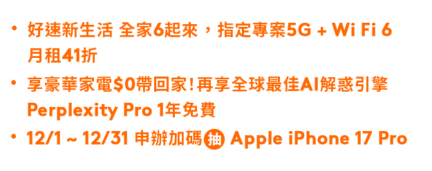 - 網路門市限定,申辦加碼抽Apple iPhone 17 Pro