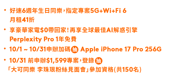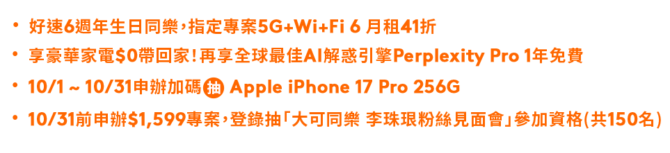 - 網路門市限定,申辦加碼抽Apple iPhone 17 Pro 256G