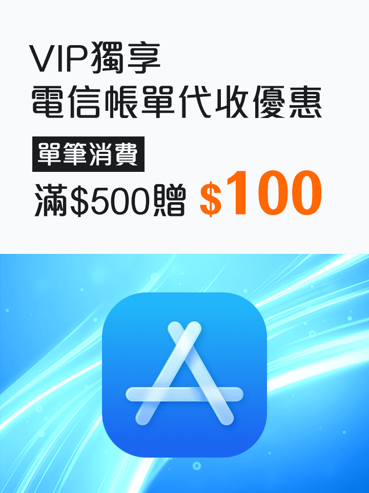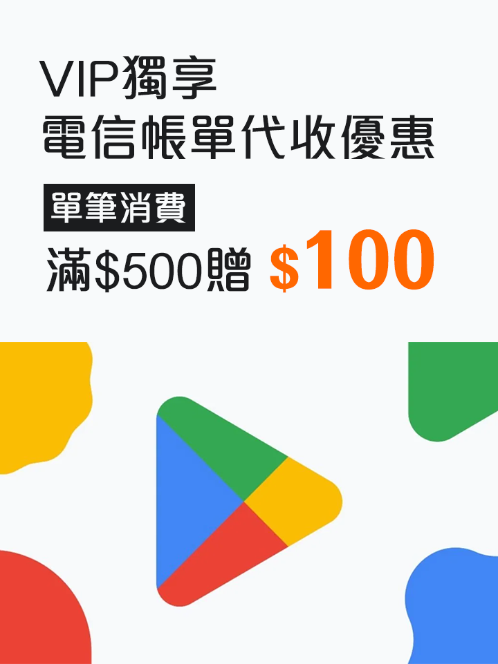 電信帳單代收單筆消費滿$500,贈帳單折抵金$100 (限Google Play或App Store) |