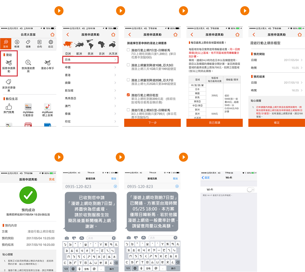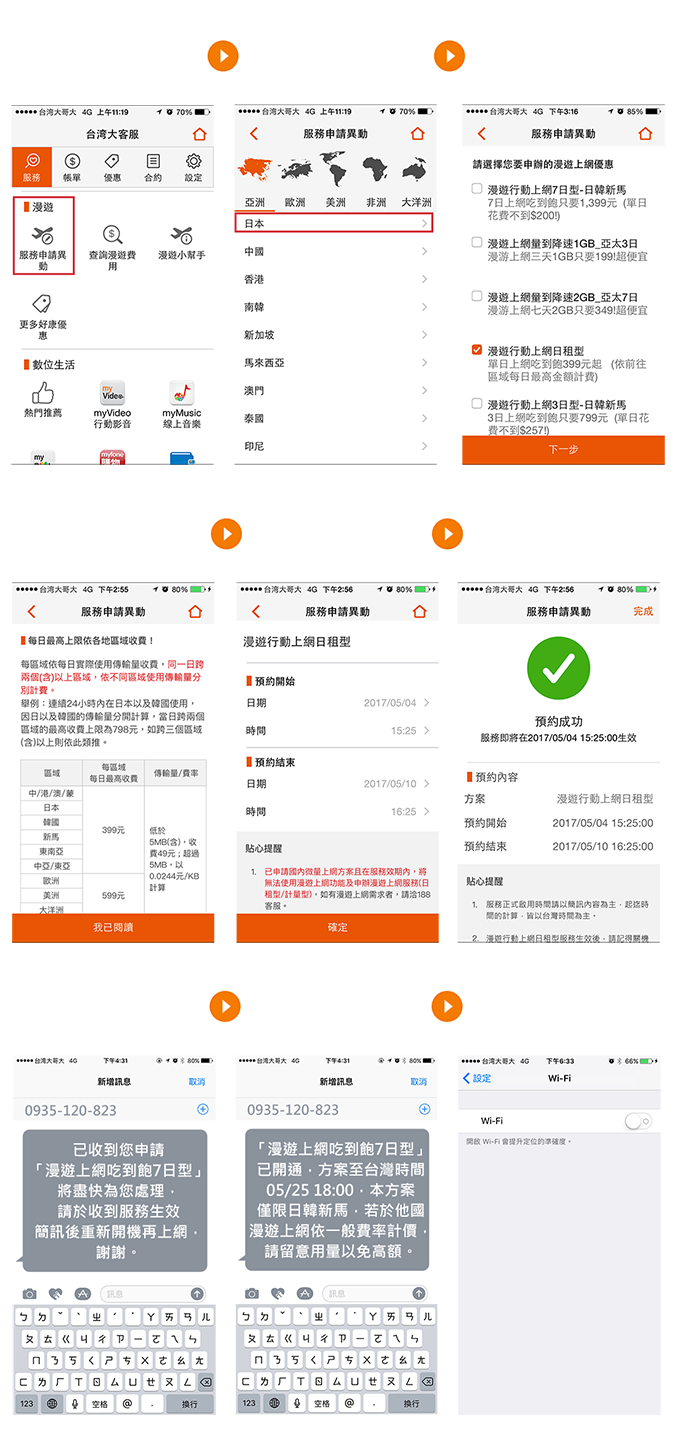 【重要提醒】因日本業者已終止3G網路,若手機未開啟VoLTE功能並申請漫遊上網方案,則無法於當地使用漫遊服務(含撥打/接聽電話、發送/接收簡訊及上網),提醒您於出國前完成以下步驟: